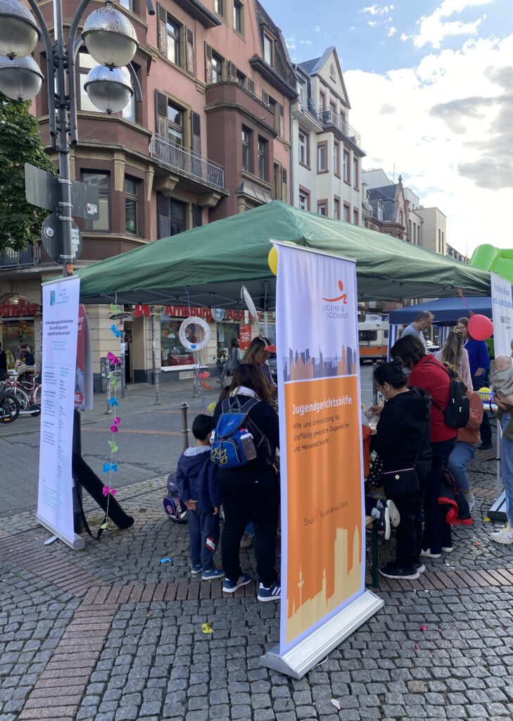 Am 22. September 2023 veranstaltete der Stadtteil- Arbeitskreis Nordend/ Bornheim am Uhrtürmchen erneut Power am Tower. Verschiendene Einrichtungen stellten sich vor und und boten Unterhaltung, Mitmachaktionen sowie Infos zu Ihren Angeboten für Kinder, Jugendliche und Familien an. Zusammen mit der Jugendhilfe im Strafverfahren Frankfurt bastelten wir gemeinsam mit Kinder und Eltern bunte, mit Perlen und Federn bestückte, Traumfänger. Das Kreativangebot fand großen Anklang und es herrschte ein buntes Treiben am Basteltisch.